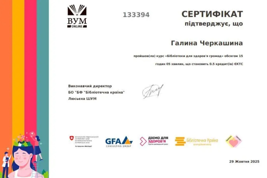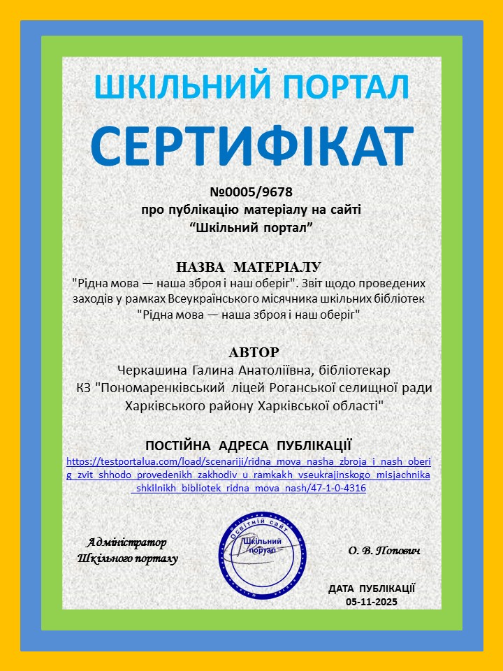 бібліотекар КЗ "Пономаренківський ліцей Роганської селищної ради Харківського району Харківської області"